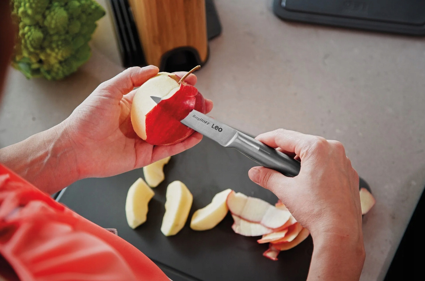 Ten nóż do obierania jest wykonany z wysokiej jakości stali nierdzewnej, która nie tylko pozostaje ostra przez długi czas, ale także jest bardzo łatwa w utrzymaniu w czystości. Noże w tej kolekcji posiadają jednolita budowę, która płynne przechodzi od ostrza ze stali nierdzewnej do dopasowanej rękojeści ze stali nierdzewnej. Wydrążony uchwyt zapewnia wygodny i ergonomiczny chwyt. Ten nóż jest częścią uniwersalnego bloku na noże ze zintegrowaną ostrzałką do noży i dołączonymi deskami do krojenia.