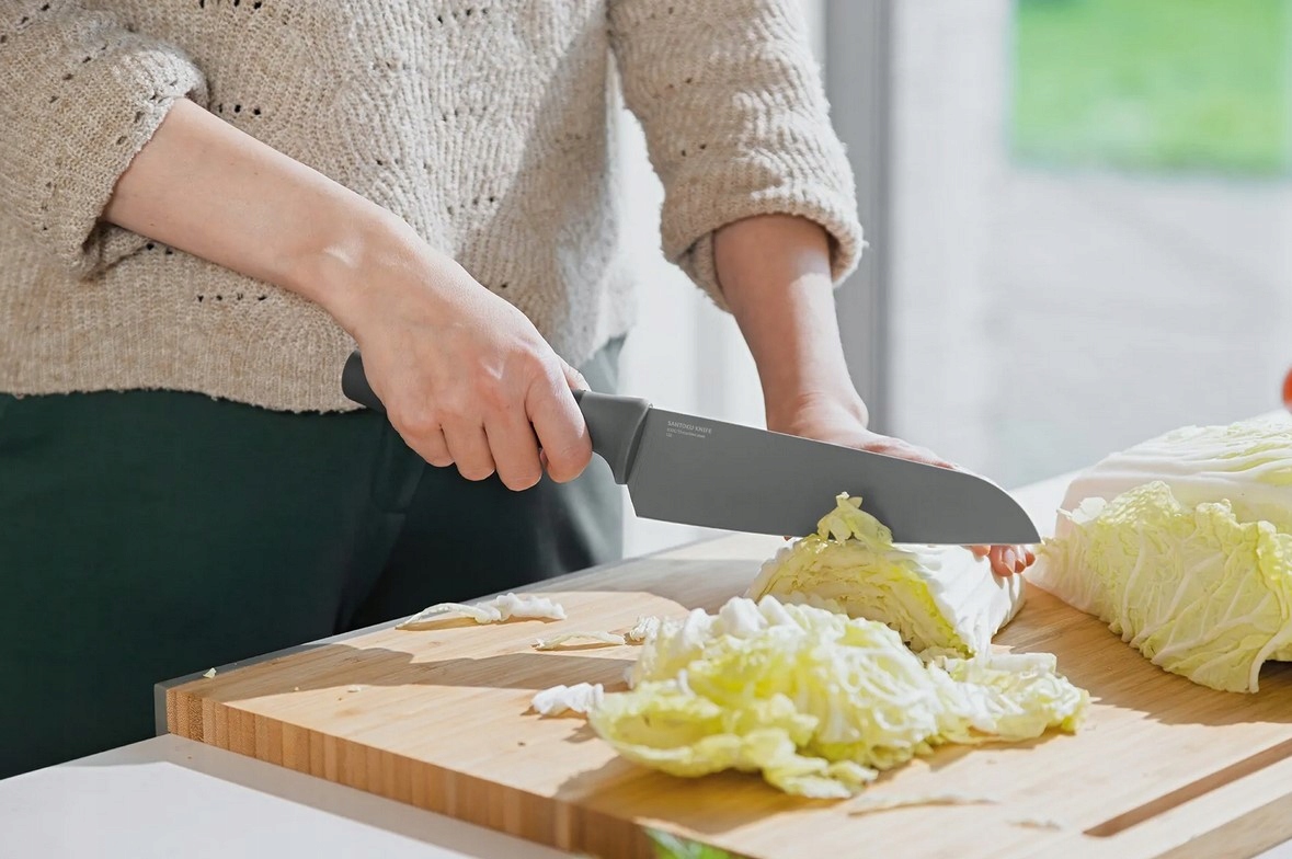 Nóż Santoku Leo jest wszechstronnym nożem do szerokiej gamy zadań. Szczególnie krojenie warzyw jest dziecinnie proste dzięki szerokiemu i lekkiemu ostrzu, które pozwala na szybkie siekanie. Dodatkowo powłoka nieprzywierająca powoduje, że składniki nie przyklejają się do ostrza, a to sprawia, że przygotowywanie posiłku nigdy nie było łatwiejsze. Jeżeli, tak jak my, dbasz o bardziej zieloną przyszłość, z pewnością docenisz fakt, że rączka noża wykonana jest z tworzywa pochodzącego z recyklingu.