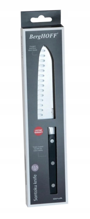 Nóż Santoku Gene 13,5 cm marki BergHOFF, wykonany ze stali nierdzewnej, to wszechstronne narzędzie kuchenne idealne do siekania, krojenia i szatkowania. Wyposażony w ergonomiczny uchwyt, zapewnia wygodę i precyzję podczas pracy, doskonale sprawdzając się w codziennym gotowaniu.