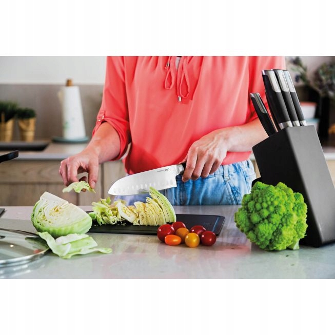 Japońska wersja noża szefa kuchni jest świetnym, wszechstronnym narzędziem, którego można używać do różnych zadań związanych z krojeniem. Szerokie, proste ostrze noża Santoku czyni go nie tylko idealnym do krojenia i siekania, ale także do typowych czynności, takich jak miażdżenie czosnku i nabieranie posiekanych składników. Dzięki wyprofilowanej rękojeści noża, która zapewnia pewny chwyt, oraz ręcznie ostrzonemu ostrzu ze stali nierdzewnej, wkrótce stanie się jednym z Twoich ulubionych narzędzi w kuchni!