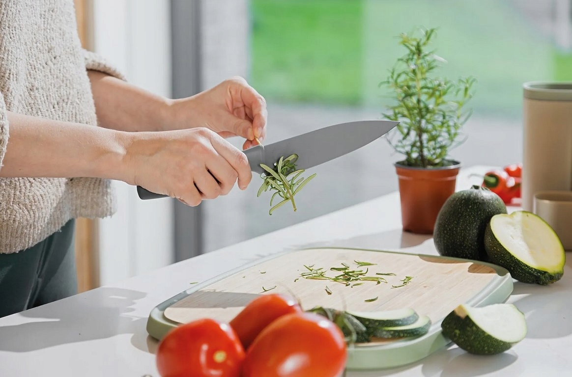Dodaj potrawom smaku dzięki świeżo pokrojonym ziołom. Mały nóż szefa kuchni Leo ma idealnie dobrane ostrze do siekania natki pietruszki, szczypiorku czy kolendry ... ale poradzi sobie również z ziołowymi łodygami. Po prostu przeciągnij łodygę przez otwór odpowiedniej wielkości, oberwij listki i gotowe. A jeżeli, tak jak my, dbasz o bardziej zieloną przyszłość, z pewnością docenisz fakt, że rączka noża wykonana jest z tworzywa pochodzącego z recyklingu.