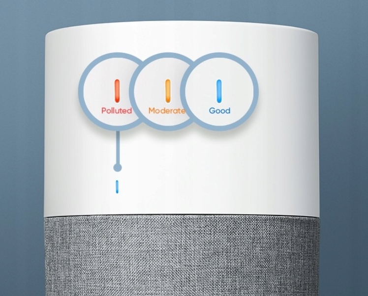 Śledź na bieżąco stan powietrza w pomieszczeniach dzięki wskaźnikowi LED jakości powietrza (AQI). Wyświetlacz zmienia kolor, informując o dobrej, średniej lub złej jakości powietrza na podstawie aktualnego stężenia drobnych cząstek (PM2.5) mierzonego przez zintegrowany czujnik cząstek.