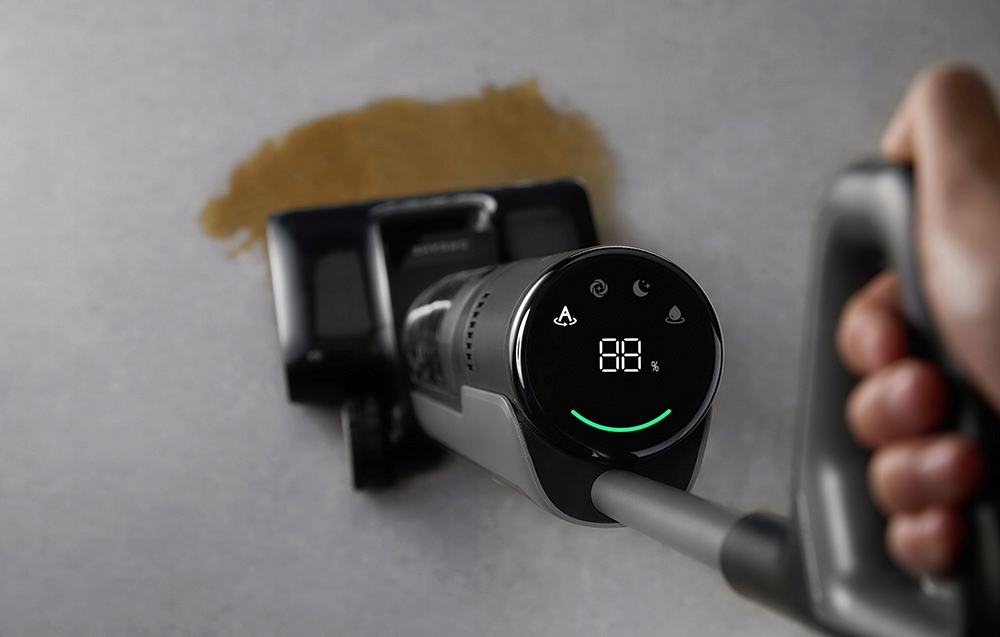 Czytelny i intuicyjny wyświetlacz LED oraz komunikaty głosowe informują o aktualnym stanie urządzenia, poziomie zabrudzeń oraz konieczności konserwacji. Inteligentne czujniki wykrywające zabrudzenia zmieniają kolor pierścienia świetlnego w zależności od poziomu zabrudzenia — zielony oznacza czystą powierzchnię, pomarańczowy to lekkie zabrudzenia, natomiast czerwony sygnalizuje silne zabrudzenia wymagające intensywnego czyszczenia.