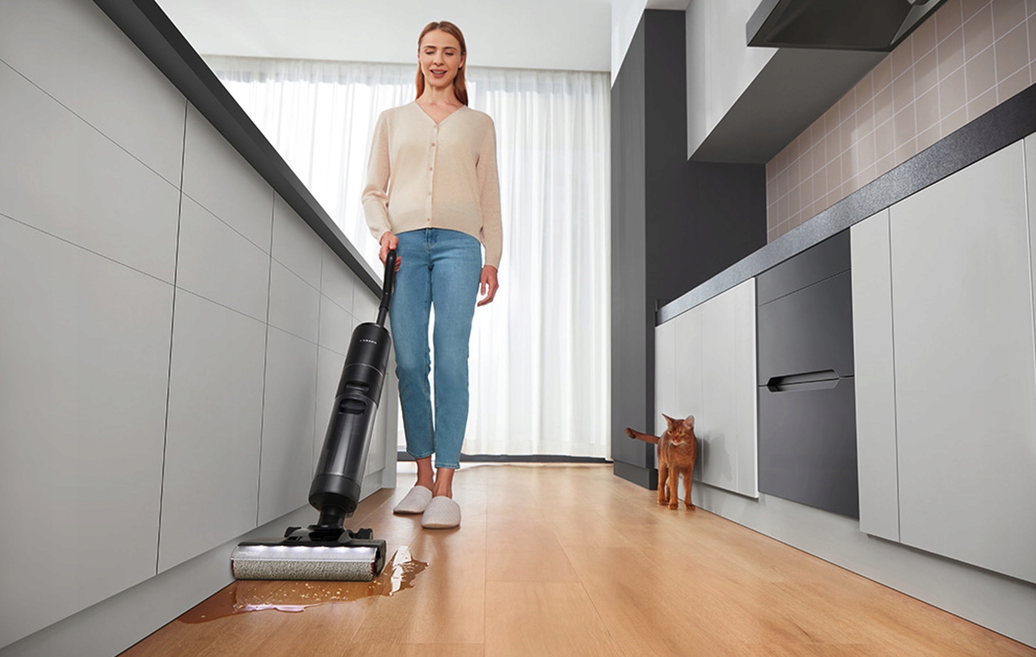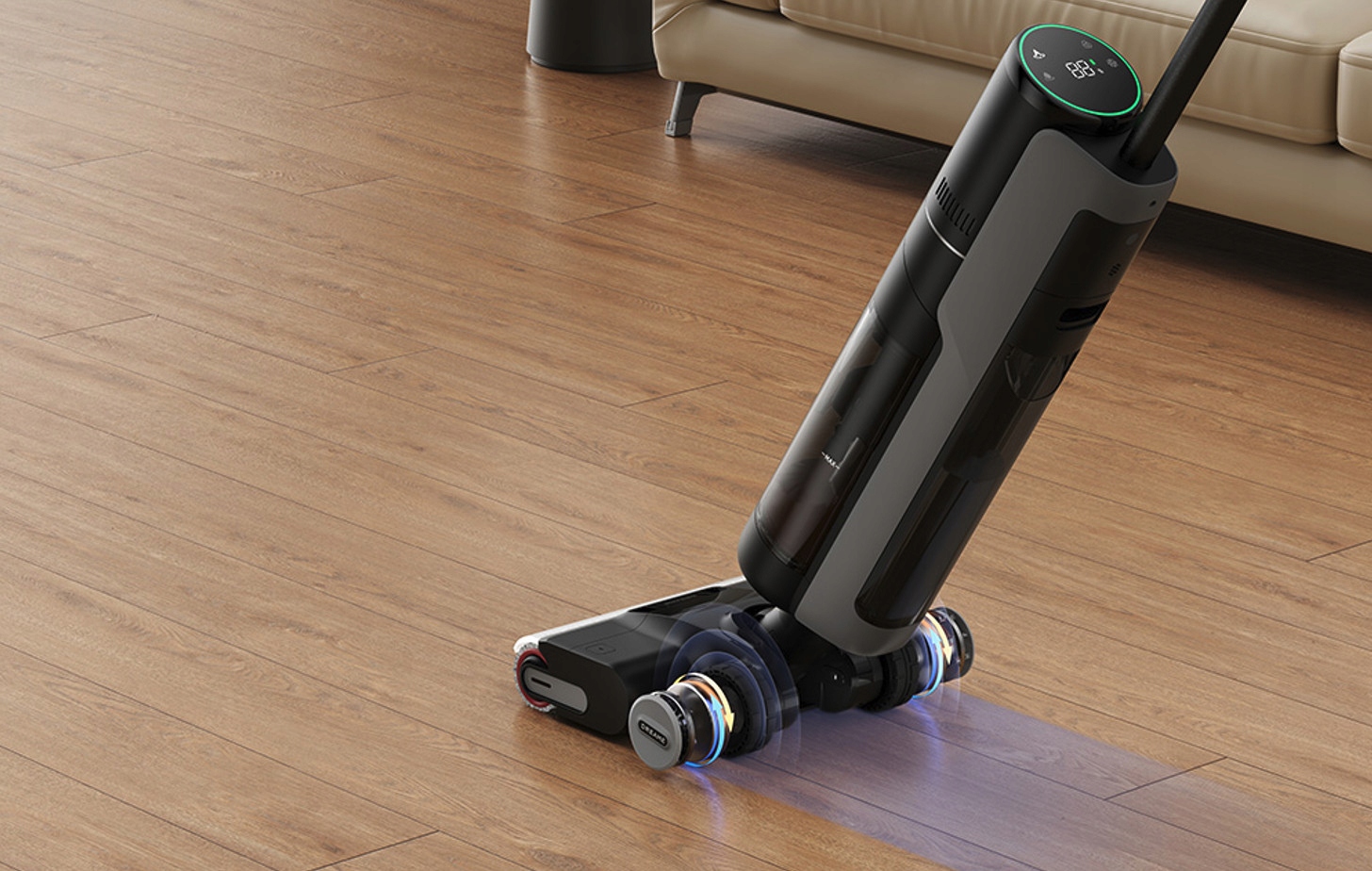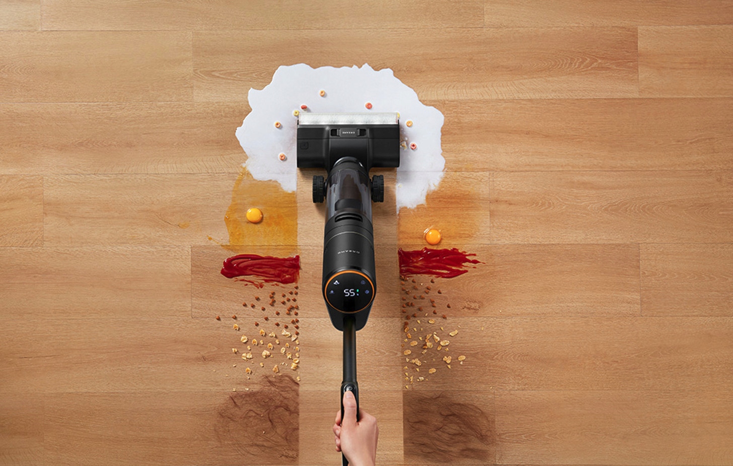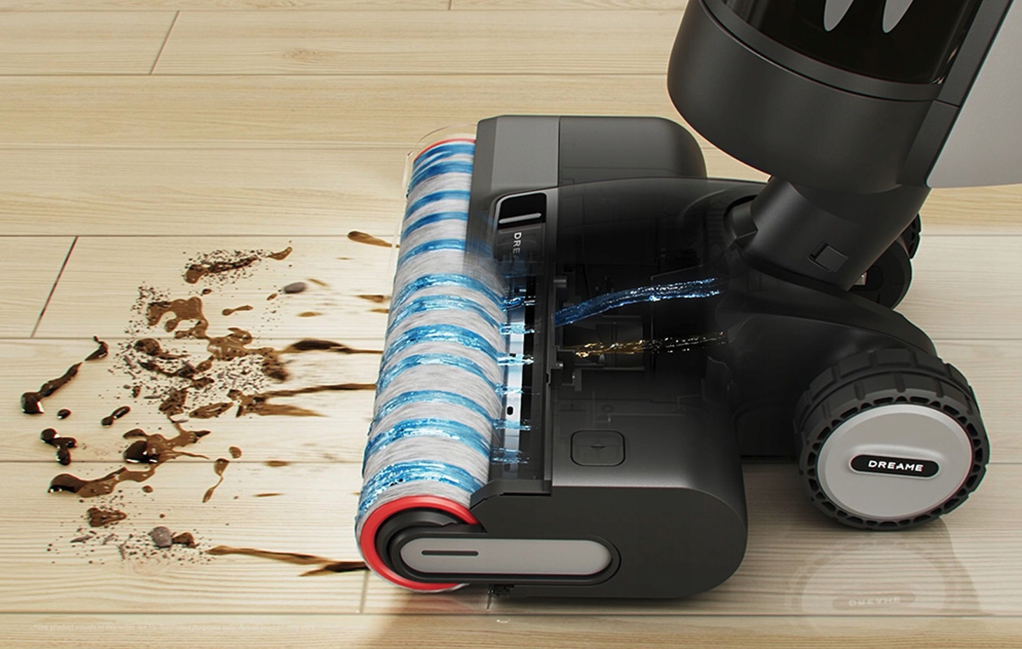 Dreame H13 Pro wykorzystuje podwójne obroty szczotki naśladujące ruch mycia rąk, co zapobiega plątaniu się włosów i utrzymuje szczotkę w czystości. Specjalny sprężysty skrobak ściśle przylega do szczotki, wyciskając wodę i usuwając brud, podczas gdy odwrotne obroty kierują włosy do zbiornika na zużytą wodę. Dzięki temu odkurzacz efektywnie zbiera rozlane płyny i usuwa plamy z trudno dostępnych miejsc, takich jak narożniki i listwy przypodłogowe.