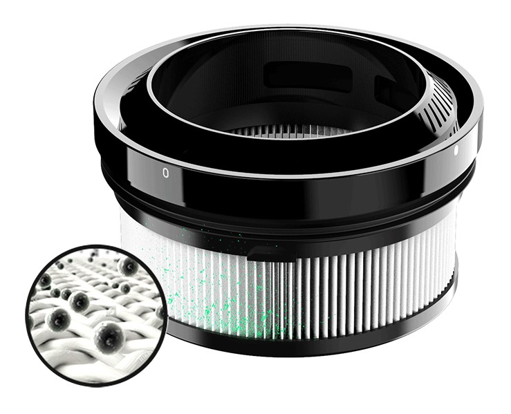 Odkurzacz ma zaawansowany system filtracji. W środku rękojeści znajduje się cylidryczny filtr HEPA. W zestawie otrzymasz także zapasowy filtr, dzięki czemu, powietrze podczas odkurzania będzie skutecznie oczyszczane. To idealne rozwiązanie dla alergików.