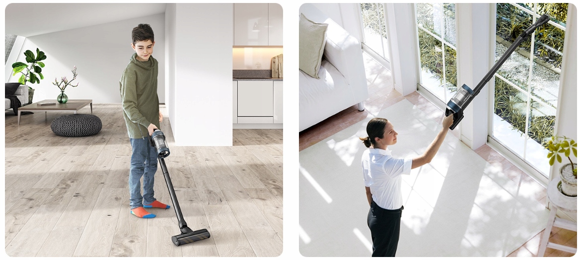 Sprzątaj dom bez zbędnego wysiłku, ciesząc się łatwą kontrolą i płynnym ruchem odkurzacza. Jego lekka konstrukcja gwarantuje maksymalną wygodę użytkowania, a także zmniejsza obciążenie nadgarstka. Korpus urządzenia waży zaledwie 1,44 kg, a zatem o 24% mniej* niż w przypadku konwencjonalnych odkurzaczy Samsung. Teraz bez trudu odkurzysz całe mieszkanie.