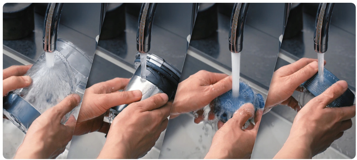 Filtry i pojemnik na kurz, które można umyć pod bieżącą wodą