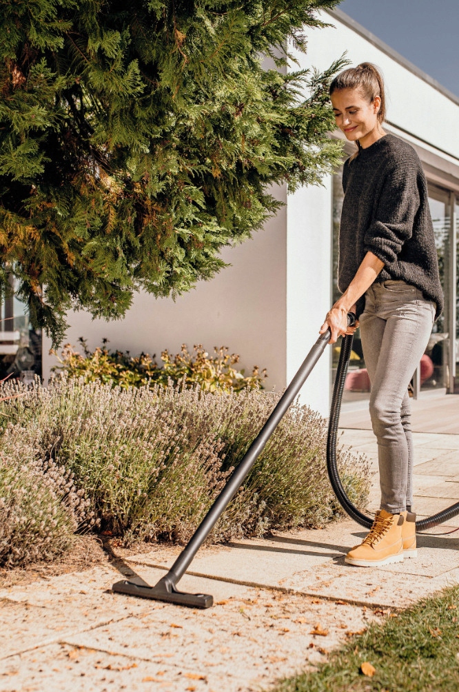 Odkurzacz uniwersalny WD 3 V-17/4/35 ze zbiornikiem z tworzywa sztucznego o pojemności 17 l, przewodem o długości 4 m i wężem ssącym o długości 3,5 m zawiera dyszę samochodową i wyjątkowo długą dyszę szczelinową.