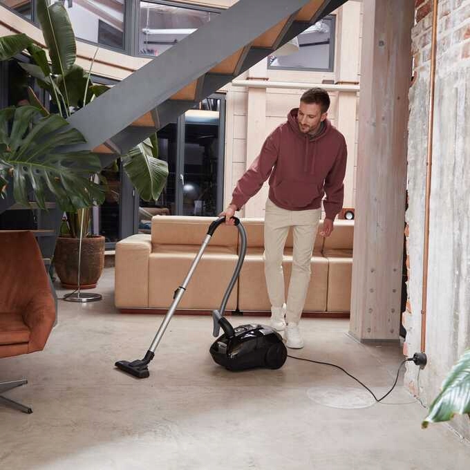 - Cechy dodatkowe: Możliwość postawienia pionowo do wygodnego przechowywania, Zwijany przewód zasilający o długości 7m|Przyjazny alergikom, Regulacja przepływu powietrza w uchwycie, Ergonomiczny uchwyt|Zmywalny filtr HEPA, Regulacja mocy ssania, Zabezpieczenie przed przegrzaniem