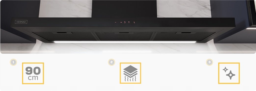 Okap KCD 0991 B został zaprojektowany z dbałością o detale. Czarna prosta obudowa urządzenia perfekcyjnie współgra z jasną listwą LED. Widoczne od spodu filtry są dobrane pod kolor obudowy, by stworzyć z nią spójną całość. Okap w takiej formie przypadnie do gustu miłośnikom wnętrz loftowym, glam-loftowych i nowoczesnych.