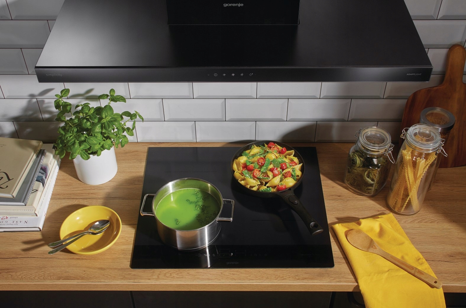 Innowacyjna funkcja czujnika AdaptLight okapu Gorenje Simplicity automatycznie wykrywa, kiedy ktoś stoi przed płytą, aby rozpocząć gotowanie i włączyć światło.