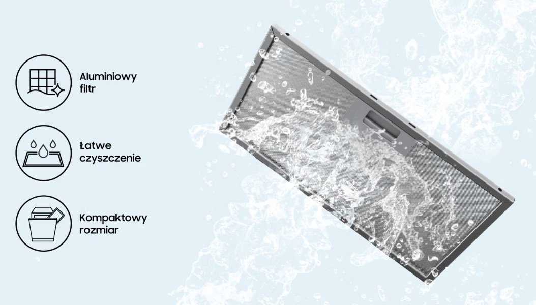 Aluminiowy filtr wychwytuje tłuszcz i kurz, zanim zatkają silnik lub przykleją się do wentylatora, ograniczając przepływ powietrza. Regularne czyszczenie filtra aluminiowego pomaga utrzymać wydajność okapu. Zaleca się czyszczenie go co 3-4 tygodnie, a jego konstrukcja pozwala na łatwe mycie w zmywarce.