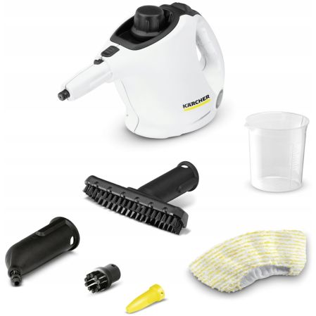 Parownica Kärcher SC 1 ma małe rozmiary i dzięki temu idealnie nadaje się do szybkiego czyszczenia małej kuchni lub łazienki. Urządzenie w kolorze białym. Parownica pomimo swoich niewielkich rozmiarów doskonale radzi sobie z utrzymaniem hignienicznej czystości. Urządzenie wyposażono w bezpieczny zawór ciśnieniowy zapobiegający otwarciu bojlera, gdy panuje w nim wysokie ciśnienie. Dysza power będąca jednym z elementów wyposażenia standardowego zwiększa skuteczność odspajania brudu. Ułatwia także strumieniowi pary dotrzeć do kątów, szczelin i narożników.