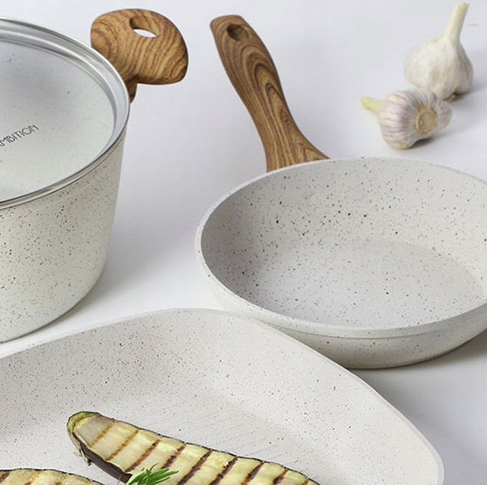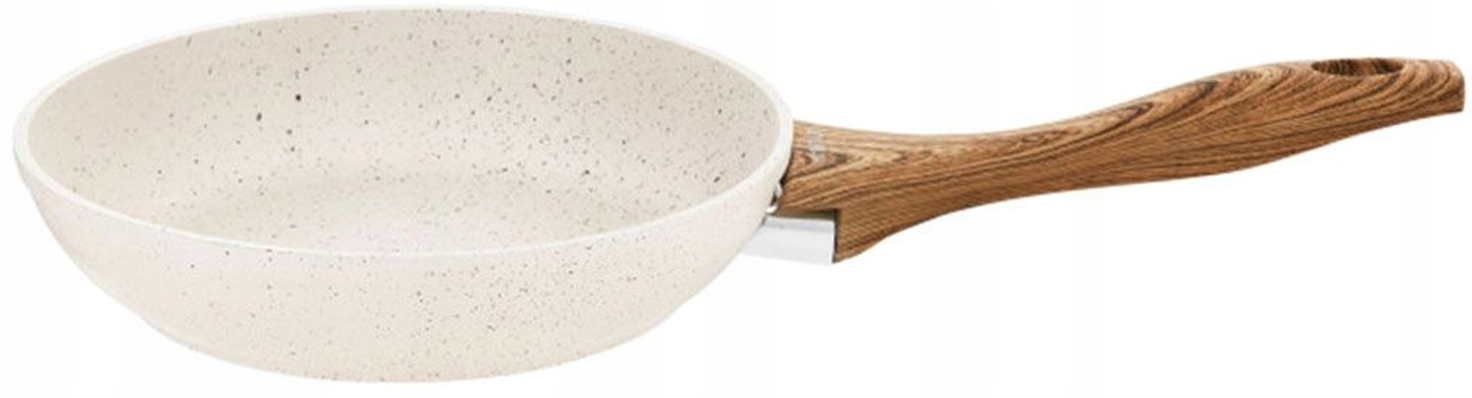 Korpus naczynia swoj? faktur? przypomina kamie?, a r?czki imituj? drewno. Naczynia wykonane z odkuwanego aluminium doskonale akumuluj? ciep?o, czyni?c gotowanie bardziej energooszcz?dnym. Posiadaj? grube wielowarstwowe dno indukcyjne odporne na odkszta?cenia. Wewn?trz pokryte pow?ok? nieprzywieraj?c? o unikalnym wygl?dzie imituj?cym kamie?. Na zewn?trz pokryte odporn? na wysokie temperatury pow?ok? o chropowatej powierzchni w tym samym kolorze co pow?oka wewn?trz. R?czki pokryte antypo?lizgowym materia?em Soft Touch imituj?cym drewno, zapewniaj? pewne trzymanie w d?oni.