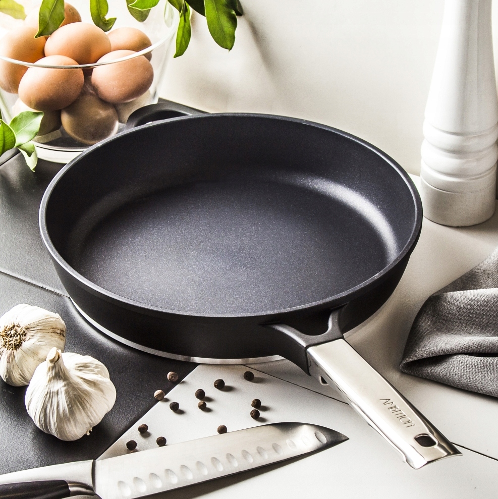 - Grube dno wielowarstwowe, przystosowane do użytku na wszystkich rodzajach kuchenek, w tym płytach indukcyjnych (oprócz brytfanny owalnej)
