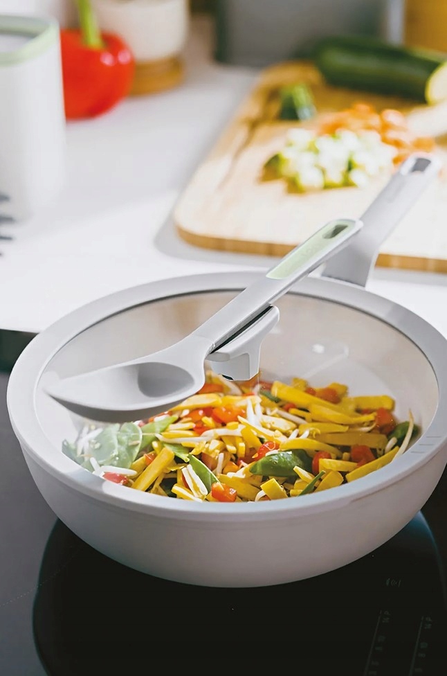 Masz ochotę na smaczne stir-fry, aromatyczną paellę lub pikantne risotto? Dzięki tej patelni do smażenia stir-fry stworzysz najsmaczniejsze przysmaki w mgnieniu oka! Korpus wykonany w 100% z aluminium pochodzącego z recyklingu gwarantuje szybkie i równomierne, energooszczędne rozprowadzanie ciepła na każdym rodzaju kuchenki, w tym indukcyjnej. Patelnia pokryta jest wysokiej jakości, trwałą i zdrową ceramiczną powłoką nieprzywierającą, która nie tylko pozwala na gotowanie z małą ilością oleju, ale także sprawia, że patelnia jest łatwa w czyszczeniu. Dodaj do tego nienagrzewające się uchwyty oraz przezroczystą szklaną pokrywę ze zintegrowaną funkcją odcedzania, a otrzymasz patelnię do mieszania potraw, która jest wyjątkowo przyjazna dla użytkownika.