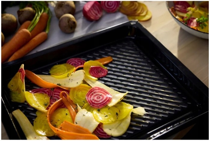 Dlaczego nie upiec własnych chipsów ziemniaczanych? Albo nie zrobić chipsów ze świeżych warzyw zamiast ziemniaków? Umieść cienko pokrojone ziemniaki lub inne warzywa na tacy Air Fry dodaj odrobinę oleju i wybierz funkcję Air Fry, a niedługo potem zasiądziesz przed telewizorem z pysznymi domowymi chipsami. A oto kolejna wskazówka: tacę Air Fry & Grill możesz również wykorzystać do przygotowywania potraw z grilla.