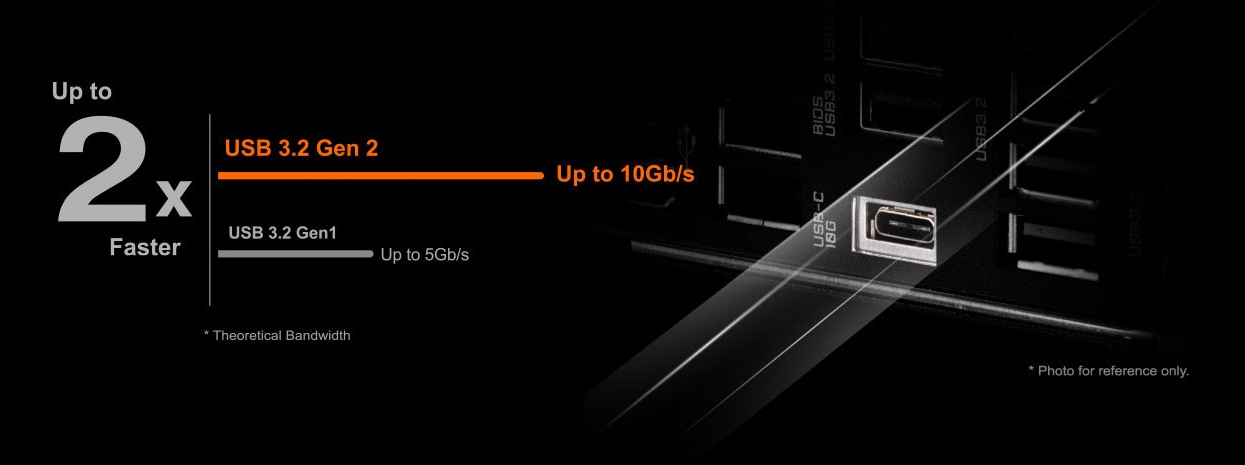 Porty USB 3.2 Gen 2 zapewniają prędkość do 10 Gb/s. Dzięki dwukrotnie większej przepustowości w porównaniu z poprzednią generacją, a także wstecznej kompatybilności z USB 3.2 Gen 1 i USB 2.0, znacznie ulepszony protokół USB 3.2 Gen 2 jest dostępny w nowym odwracalnym USB Type-C™ i tradycyjnym USB Type-A złącze zapewniające lepszą kompatybilność z szerszą gamą urządzeń.