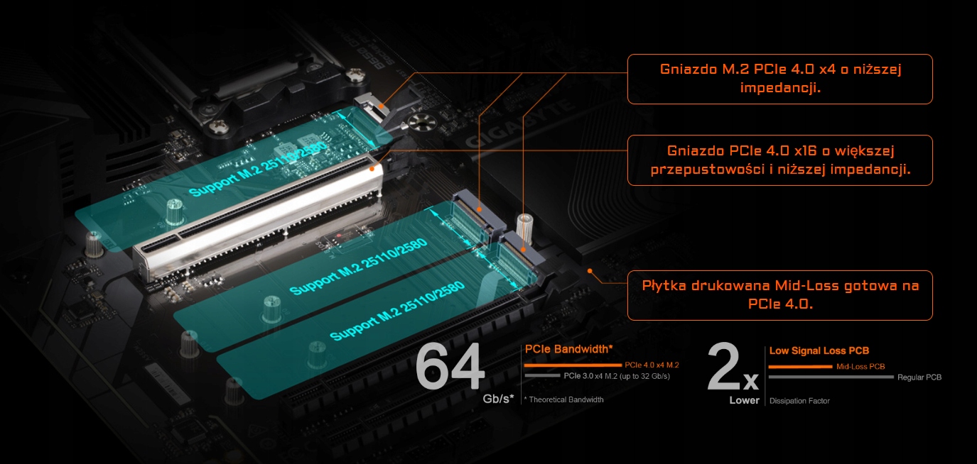 Płyty główne GIGABYTE B650 są gotowe do pracy z urządzeniami PCIe 4.0, od których oczekuje się dwukrotnie większej przepustowości niż obecne urządzenia PCIe 3.0. Aby osiągnąć wysoką prędkość i utrzymać dobrą integralność sygnału, GIGABYTE wykorzystuje płytkę PCB o niskiej impedancji, aby zapewnić maksymalną wydajność.
