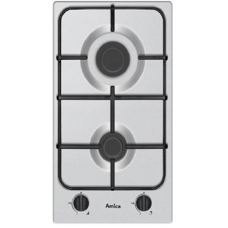 Płyta gazowa Amica ze stali nierdzewnej o szerokości 29cm z dwoma palnikami i emaliowanymi rusztami.