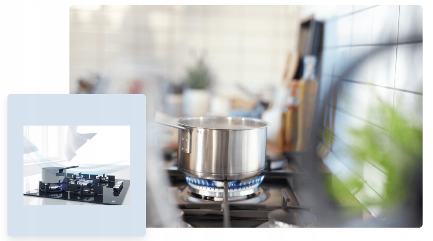 Płomień może łatwo zgasnąć, gdy nie ma cię w pobliżu, uwalniając niebezpieczny gaz do domu. Zabezpieczenie przeciwwypływowe gazu wykrywa, kiedy płomień palnika zostaje zgaszony przez zawartość garnka, która wykipiała, lub przez podmuch wiatru, a następnie odcina dopływ gazu. Bez wycieków i bez obaw.