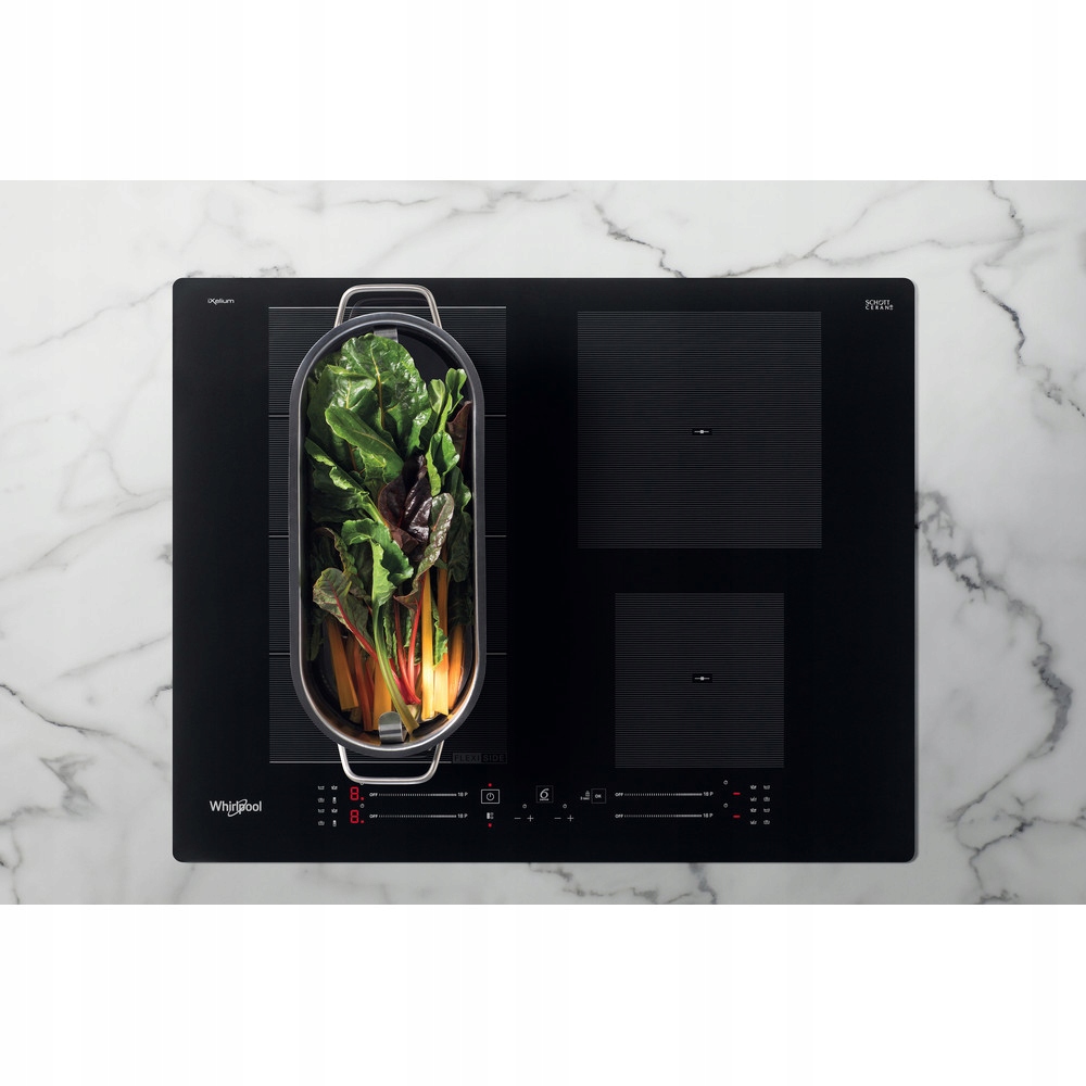 Garnki i patelnie mo?na dowolnie ustawia? na dedykowanej powierzchni p?yty (FlexiSide), powsta?ej z po??czenia dw?ch s?siaduj?cych w pionie p?l grzewczych. Dedykowana strefa FlexiSide sterowana jest przy pomocy jednego slidera.