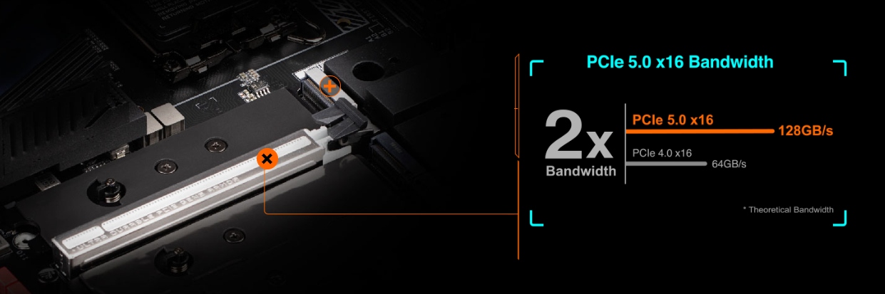 Konstrukcja PCIe 5.0 obsługuje dwukrotnie większą przepustowość niż PCIe 4.0 i zapewnia pełną kompatybilność z najnowocześniejszymi dyskami SSD i procesorami graficznymi wydanymi w ciągu najbliższych kilku lat. Pierwsze gniazdo PCIe 5.0 x4 M.2 obsługuje najnowszy format M.2 25110. Wzmocnione złącza PCIe 5.0 M.2 z metalowym ekranem zapewniającym większą wytrzymałość. Nowa generacja, ekskluzywne ekranowanie PCI-e firmy GIGABYTE ze stali nierdzewnej, staje się o 20% szersze, zapewniając zwiększoną wytrzymałość na rozciąganie.