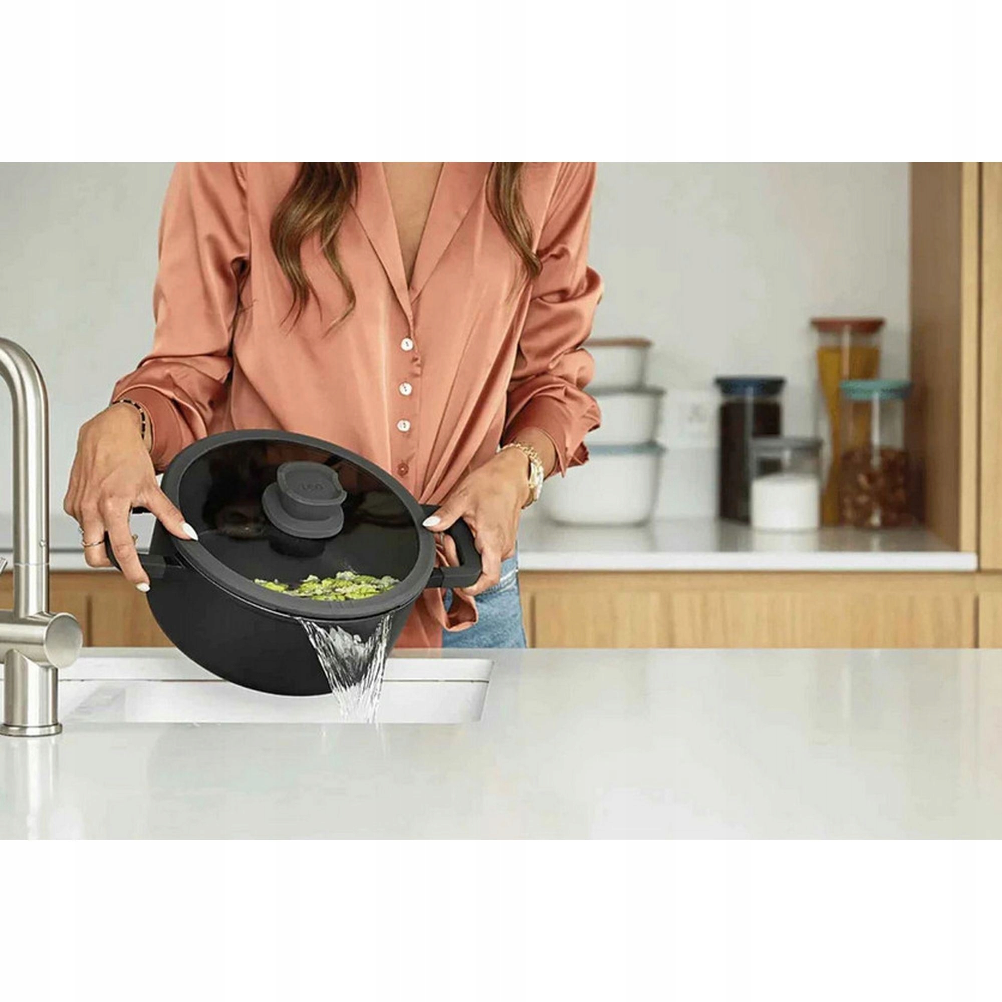 Wszechstronna, wydajna i przyjemna w użyciu - tak najlepiej można opisać tę 28-centymetrową szklaną pokrywę. Pokrywa posiada silikonową krawędź, która zapobiega grzechotaniu, oraz zintegrowany otwór do odsączania, który służy jednocześnie jako odpowietrznik pary, dzięki czemu można łatwo odcedzić zawartość garnka i nie trzeba się martwić o kipienie. Przezroczyste szkło pokrywy umożliwia obserwowanie potrawy podczas gotowania, dzięki czemu nie trzeba jej podnosić i tracić cennej energii. Dosłowną wisienką na torcie jest miękki w dotyku i nienagrzewający się uchwyt, które zapewnia bezpieczny i wygodny chwyt w każdej chwili.