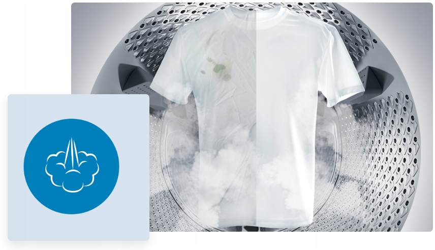 Technologia SteamCure™ wykorzystuje parę podczas prania dla jeszcze lepszego efektu. Para dodana na początku cyklu pomaga usuwać najtrudniejsze zabrudzenia, z kolei zaaplikowania na końcu zmniejsza zagniecenia. Wysoka temperatura pary pozwala trwale i efektywnie usunąć wszelkie plamy, bez konieczności stosowania dodatkowych detergentów.