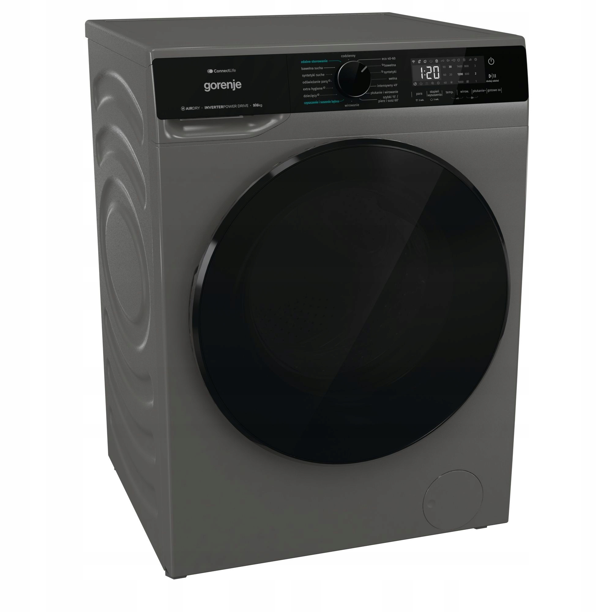 Pralko-suszarka Gorenje WD2PA964ADT/PL: Grafitowa elegancja i wydajność. Pierze 9kg, suszy 6kg. Szybkie wirowanie 1400 obr/min i technologia SteamTech dla idealnie czystych, miękkich i mniej pogniecionych ubrań. Cichy silnik Inverter PowerDrive. Oszczędność miejsca i czasu w jednym!
