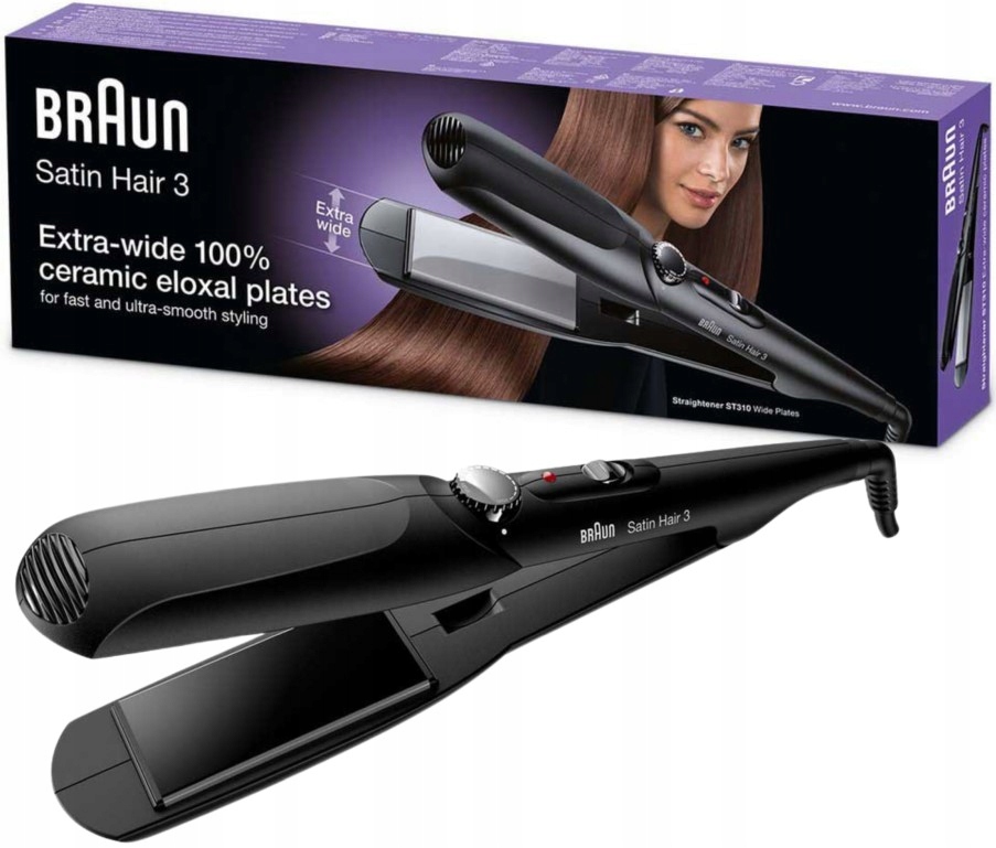 Prostownica Braun Satin-Hair 3 z wyjątkowo szerokimi płytkami zapewnia skuteczną stylizację przy maksymalnej ochronie włosów dzięki regulacji temperatury i pływającym płytkom w 100% ceramicznym.