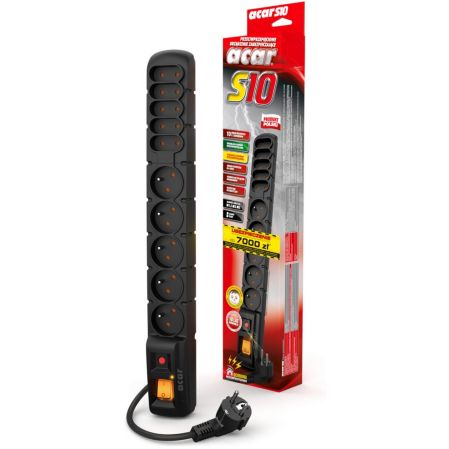 Przeciwprzepięciowe urządzenie zabezpieczające acar S10. Urządzenia tej nowoczesnej serii są wyposażone w największą liczbę gniazd sieciowych 230V spośród oferty produktów firmy HSK DATA. acar S10 został wyposażony w bezpiecznik automatyczny oraz dziesięć zabezpieczonych gniazd sieciowych 230V (5 z uziemieniem). Prostota obsługi i uniwersalność zastosowania, to podstawowe cechy urządzenia zabezpieczającego sieć 230V w domu i biurze. Duża ilość gniazd zasilających pozwala stosować pojedyncze urządzenie jako ochronę wszystkich, wymagających tego odbiorników. acar S10 posiada jeden z najlepszych współczynników ceny do ilości zabezpieczonych urządzeń. Uchwyty do mocowania są opcjonalnie dostępne u dystrybutora.