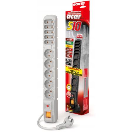 Przeciwprzepięciowe urządzenie zabezpieczające acar S10. Urządzenia tej nowoczesnej serii są wyposażone w największą liczbę gniazd sieciowych 230V spośród oferty produktów firmy HSK DATA. acar S10 został wyposażony w bezpiecznik automatyczny oraz dziesięć zabezpieczonych gniazd sieciowych 230V (5 z uziemieniem). Prostota obsługi i uniwersalność zastosowania, to podstawowe cechy urządzenia zabezpieczającego sieć 230V w domu i biurze. Duża ilość gniazd zasilających pozwala stosować pojedyncze urządzenie jako ochronę wszystkich, wymagających tego odbiorników. acar S10 posiada jeden z najlepszych współczynników ceny do ilości zabezpieczonych urządzeń. Uchwyty do mocowania są opcjonalnie dostępne u dystrybutora.