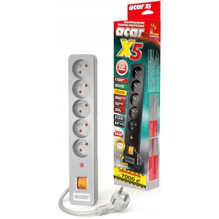 Acar X5 to jedno z najnowszych przeciwprzepi?ciowych urz?dze? zabezpieczaj?cych z oferty produkt?w acar. Sprawdzone, skuteczne i niezawodne rozwi?zania konstrukcyjne oraz nowoczesny projekt. B?yszcz?ce wyko?czenie powierzchni czo?owej podkre?la niebanalno?? i ?wie?o?? projektu wzorniczego, wyr??niaj?c produkt wizualnie. Pi?? gniazd sieciowych z uziemieniem oraz niewielkie gabaryty urz?dzenia pozwalaj? na jego wszechstronne u?ycie w domu i w biurze. Zastosowanie automatycznego bezpiecznika zapewnia praktycznie bezobs?ugow? prac?. Du?a skuteczno?? dzia?ania oraz atrakcyjny wygl?d predysponuj? go do miana podstawowego zabezpieczenia przeciwprzepi?ciowego, niezb?dnego w ka?dym miejscu. Uchwyty do mocowania s? dost?pne opcjonalnie u dystrybutora.