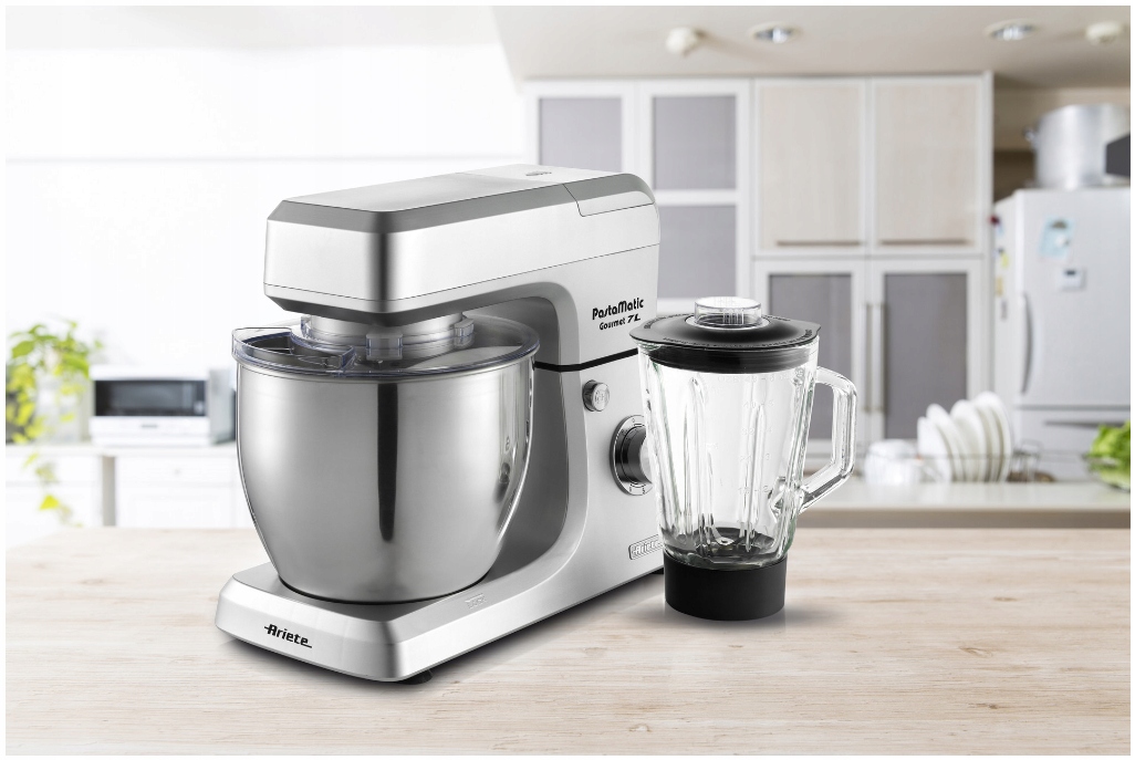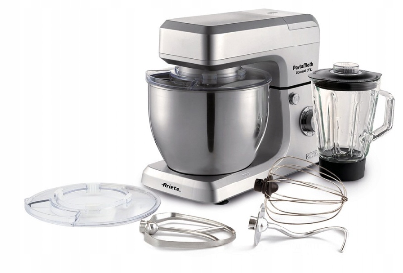 Robot planetarny z blenderem, moc maksymalna 2100 W, 6 prędkości w zakresie 47 - 240 obrotów na minutę + praca pulsacyjna, metalowa konstrukcja, końcówki do mieszania, ubijania i hak do zagniatania, metalowa misa o pojemności 7 l, blender ze szklanym kielichem o pojemności 1,5 l, wymiary 39,5x23,5x57,5 cm
