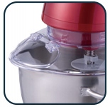 Praktyczna, przezroczysta osłona misy, zabezpiecza przed rozpryskiwaniu produktów podczas pracy urządzenia. Otwór w pokrywie pozwala na dodawanie składników w trakcie pracy, bez konieczności podnoszenia pokrywy.
