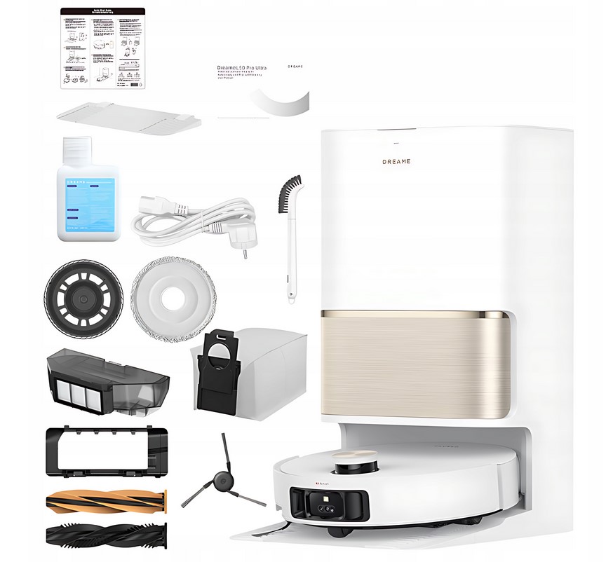 - Załączone wyposażenie: Główna szczotka (zamontowana)|Osłona szczotki (zamontowana)|Pady mopujące (zamontowane) x2|Płyn do czyszczenia powierzchni (200 ml) x1|Pojemnik na kurz (zamontowany, zawiera filtr)|Robot sprzątający Dreame L50 Pro Ultra|Stacja dokująca|Szczotka boczna (zamontowana)|Uchwyt na pady mopujące x2|Worki na kurz (jeden zamontowany, jeden zapasowy) x2