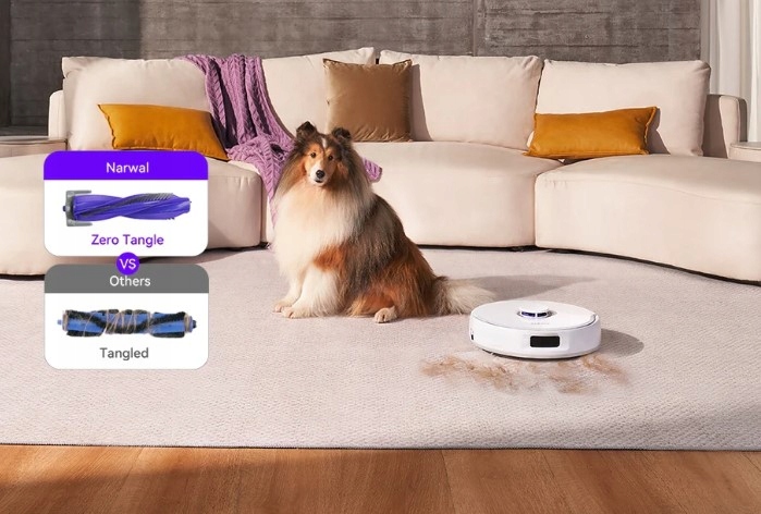 Idealnie nadający się dla właścicieli zwierząt Narwal Freo X Ultra dysponuje szczotką nieplączącą z certyfikatem SGS i TUV, która z łatwością usuwa 99% włosów z dywanów dzięki strukturalnemu designowi szczotki głównej w połączeniu z mocą ssącą, osiągając 0 zaplątań, co zapewnia sprzątanie bez plątania na każdej podłodze. Nieważne, czy sierść zwierzęca, czy długie włosy dziewczęce, z łatwością da sobie radę bez większej potrzeby usuwania splątań przez człowieka.