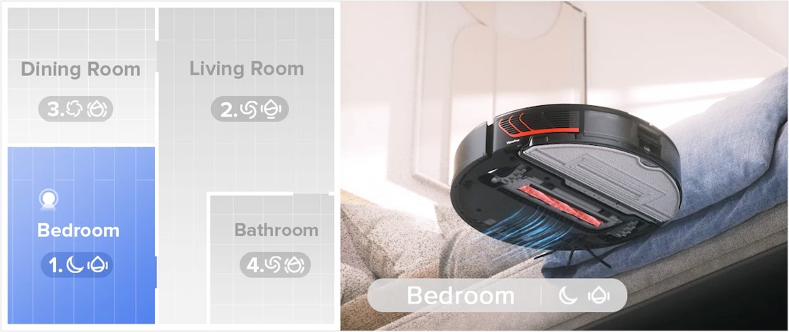 S7 MaxV nie tylko samodzielnie rozpoznaje sypialnie, salony, jadalnie i łazienki ale też sugeruje idealną kolejność sprzątania w zależności od typu pomieszczenia. Podczas sprzątania siła ssania i intensywność mopowania są automatycznie dostosowywane w celu uzyskania maksymalnej skuteczności w każdym pomieszczeniu.