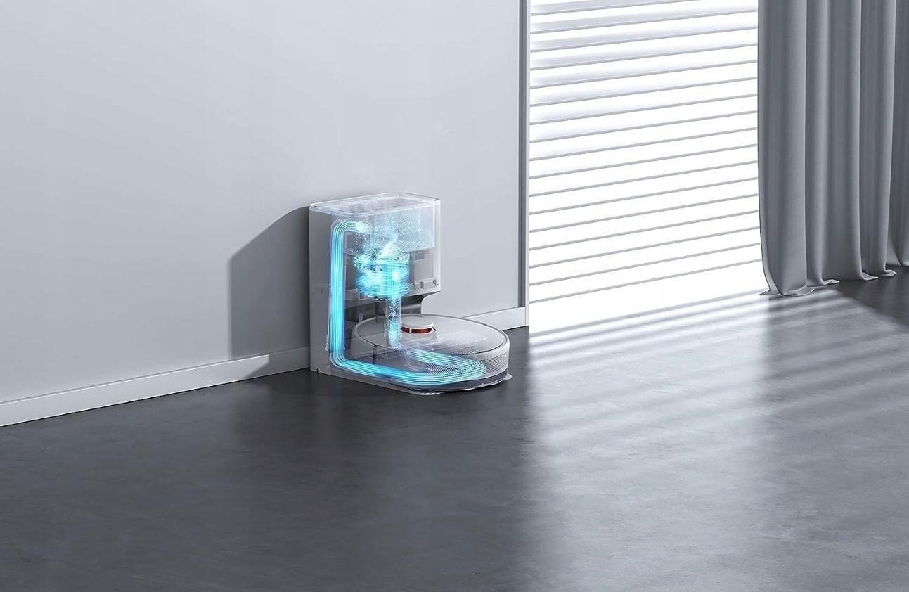 Dwukanałowa konstrukcja podstawy do zbierania kurzu z potężnym ssaniem 17 000 Pa natychmiast opróżnia pojemnik na kurz. Wbudowany worek na kurz może zbierać i opróżniać kurz ponad 60 razy i zamyka się automatycznie po podniesieniu, dzięki czemu nie zakurzysz siebie ani otoczenia.