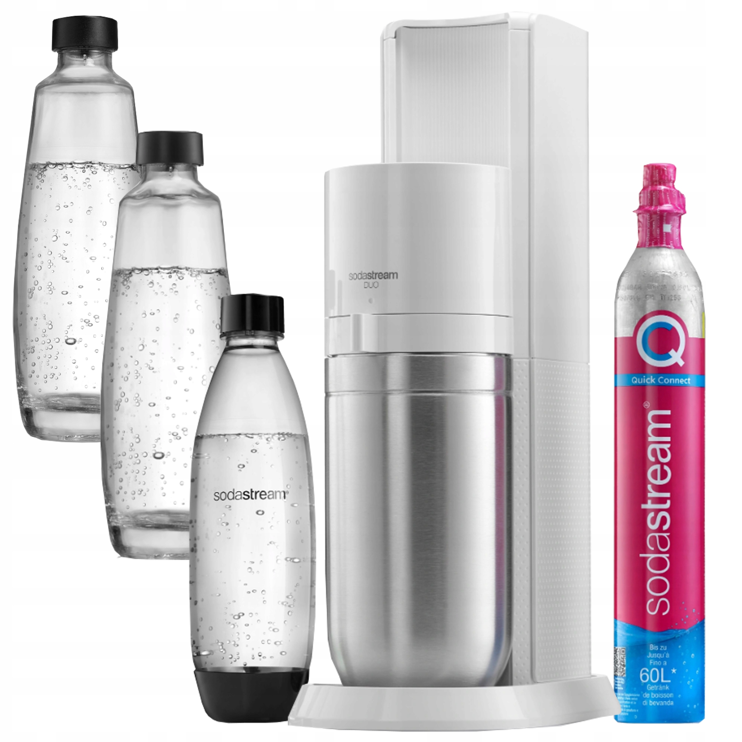 Zestaw marki SodaStream, w skład którego wchodzą Saturator SodaStream DUO + Cylinder + 2 Butelki szklane 1l Duo + 1 butelka z Tritanu Fuse 1l