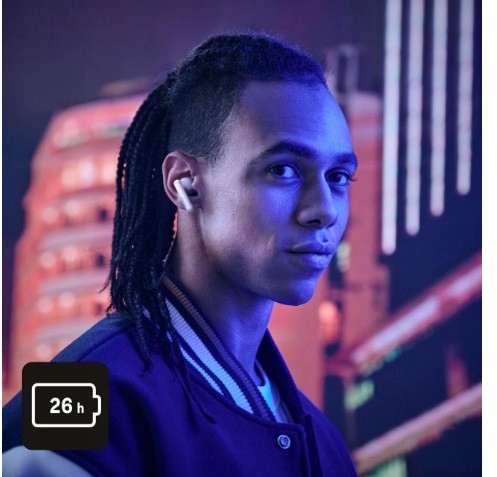 Dzięki żywotności baterii samych słuchawek do 6 godzin i dodatkowym 20 godzinom uzupełniania energii w kompaktowym etui do przechowywania i ładowania, słuchawki mogą zapewnić Ci obsługę muzyki i rozmów przez cały dzień.
