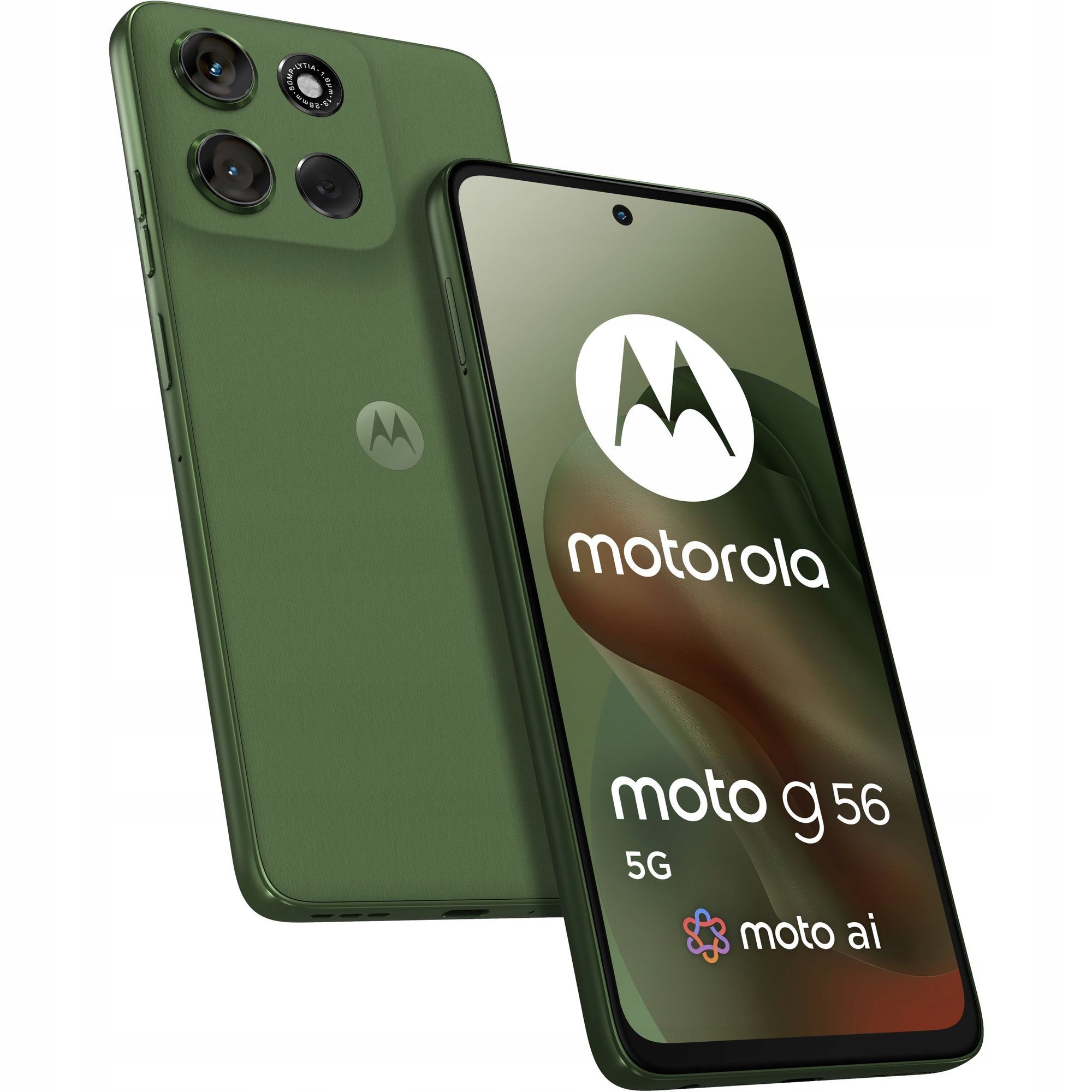 Motorola Moto G56 to smartfon z dużym ekranem 6.72", pojemną pamięcią 8/256 GB i szybkim internetem 5G, idealny do multimediów i pracy. Wyposażony w baterię 5200 mAh, port USB-C i elegancką zieloną obudowę, zapewnia wydajność i styl na co dzień.