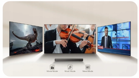 Zgodnie z różnymi wymaganiami dźwiękowymi w różnych scenach, w naszym soundbarze zaprojektowaliśmy wiele ulepszeń audio, takich jak tryb filmu, tryb muzyki i tryb wiadomości, które możesz dowolnie przełączać i cieszyć się wybranymi przez siebie efektami dźwiękowymi. Ty decydujesz!