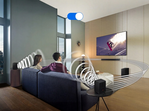 Rozszerzenie dźwięku przestrzennego rozprowadza obszar odsłuchu szerzej- zarówno w bok , jak i w górę, by jeszcze lepiej wydobyć dźwięk.