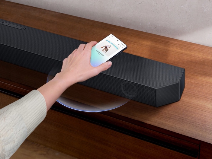 Z funkcją Dotnij i Odtwórz możesz w szybki i prosty sposób przełączać się z telefonu i słuchać na soundbarze tego, co lubisz najbardziej. Do przesyłania muzyki wystarczy tylko jeden ruch- dotknij soundbara telefonem a ten automatycznie wykryje urządzenie i odtworzy muzykę z Twojego smartfona.