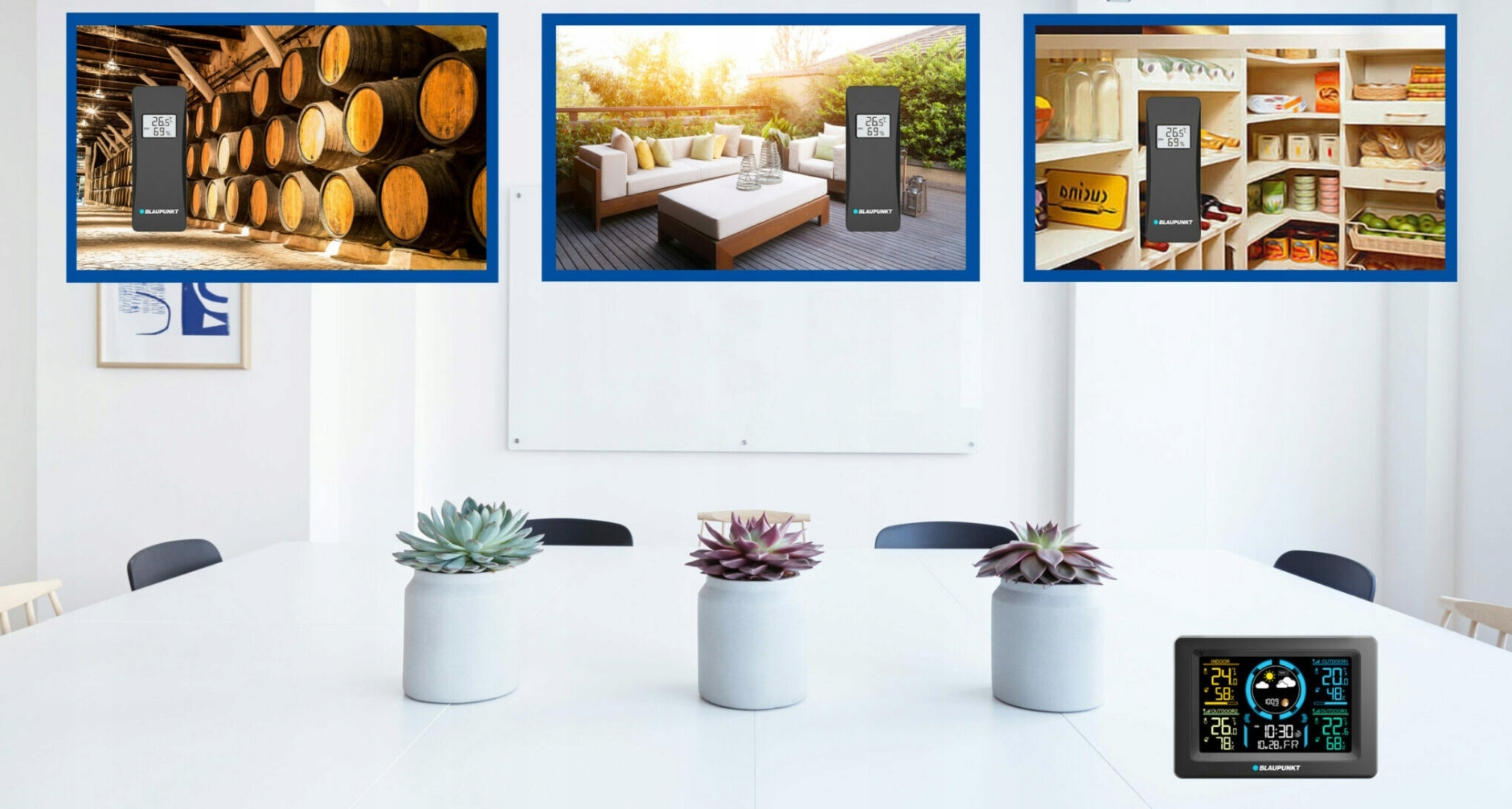 Stacja pogodowa Blaupunkt WS40BK posiada wbudowany czujnik do pomiaru temperatury i wilgotności wewnątrz pomieszczenia, w którym jest zaaplikowana. Dodatkowe, dołączone do zestawu, trzy bezprzewodowe czujniki z wyświetlaczami LCD mogą dokonywać pomiarów na zewnątrz lub w dowolnie wybranej lokalizacji. Dane dotyczące pomiarów zarówno temperatury, jak i wilgotności, są na bieżąco aktualizowane i wyświetlane na wyświetlaczu LCD, wbudowanym w stację pogodową*. Dodatkowo urządzenie posiada pamięć pomiarów najniższych i najwyższych wartości zarówno temperatury, jak i wilgotności, które resetują się automatycznie podczas rozpoczęcia się kolejnej doby. Wartości temperatury mogą być wyświetlane albo w stopniach Celsjusza albo stopniach Farenheita.