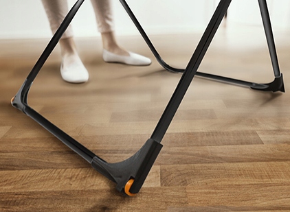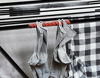 Suszarka wewnętrzna w kolorze matowej czerni. Dzięki kompaktowym wymiarom przed i po złożeniu oraz wygodnie składanym nogom, suszarka na bieliznę Universal może być łatwo przechowywana, niezależnie od wielkości pomieszczenia.