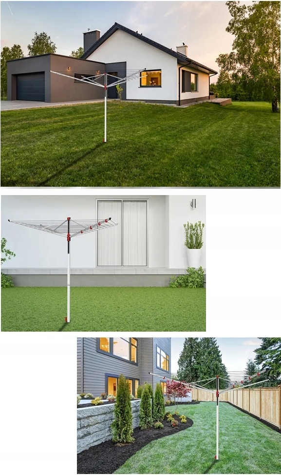 Zestaw suszarki ogrodowej zawiera specjalne mocowanie do zamontowania w betonie lub ziemi.