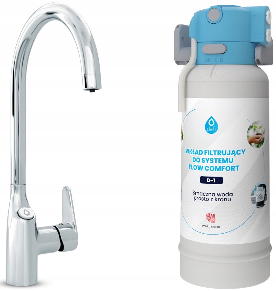 Zastosowana technologia filtracji wody oparta jest na kilku stopniach poprawy jej jakości zamkniętych w jednym wkładzie filtrującym. Woda przepływa przez warstwy włókniny polipropylenowej, złoże wysokiej jakości żywicy jonowymiennej i blok węglowy. Filtr do wody wyposażony w głowicę daje możliwość regulacji poziomu redukcji twardości węglanowej. System Flow Comfort charakteryzuje się szybkim montażem, prostą obsługą, kompaktową budową. W doskonały sposób optymalizuje wodę kranową przez redukowanie jej twardości, obniżanie zawartości chloru i szkodliwych substancji oraz wzbogaca wodę w potas. Filtr do wody Flow Comfort przewiduję zastosowanie wkładu filtrującego w różnych wariantach montażowych pod zlewem kuchennym z pobieraniem wody z typowego ujęcia zimnej wody kranowej. Filtr Dafi może być zastosowany do dystrybutorów wody. Regulacja poziomu redukcji twardości węglanowej polega na ustawieniu położenia (przekręceniu) wkładu filtrującego względem głowicy według naniesionych oznakowań. Ustawienie poziomu filtracji powinno być poprzedzone zbadaniem twardości wody wodociągowej. W trakcie okresu eksploatacji filtra poziom filtracji może być korygowany. Sprawdzenie twardości wody przeprowadza się za pomocą paska do testowania, dołączonego do zestawu. Informację o twardości udostępniają także lokalne zakłady wodociągowe.